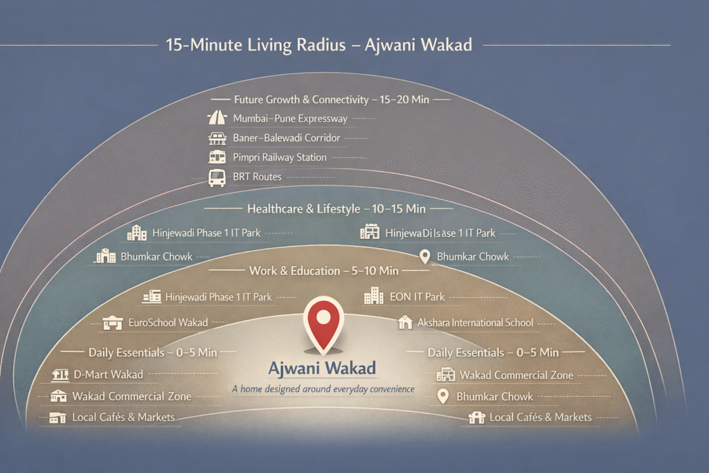 Wakad directly connects to Hinjawadi IT Park, Indiaโ€™s largest IT hub, employing over 300,000 professionals across Phases 1โ€“3 (Source: MIDC Hinjawadi Overview). Daily commute time to most tech parks ranges between 7โ€“15 minutes, while business districts such as Balewadi, Baner, Aundh and Pimpri-Chinchwad fall within a quick 10โ€“20 minute radius.